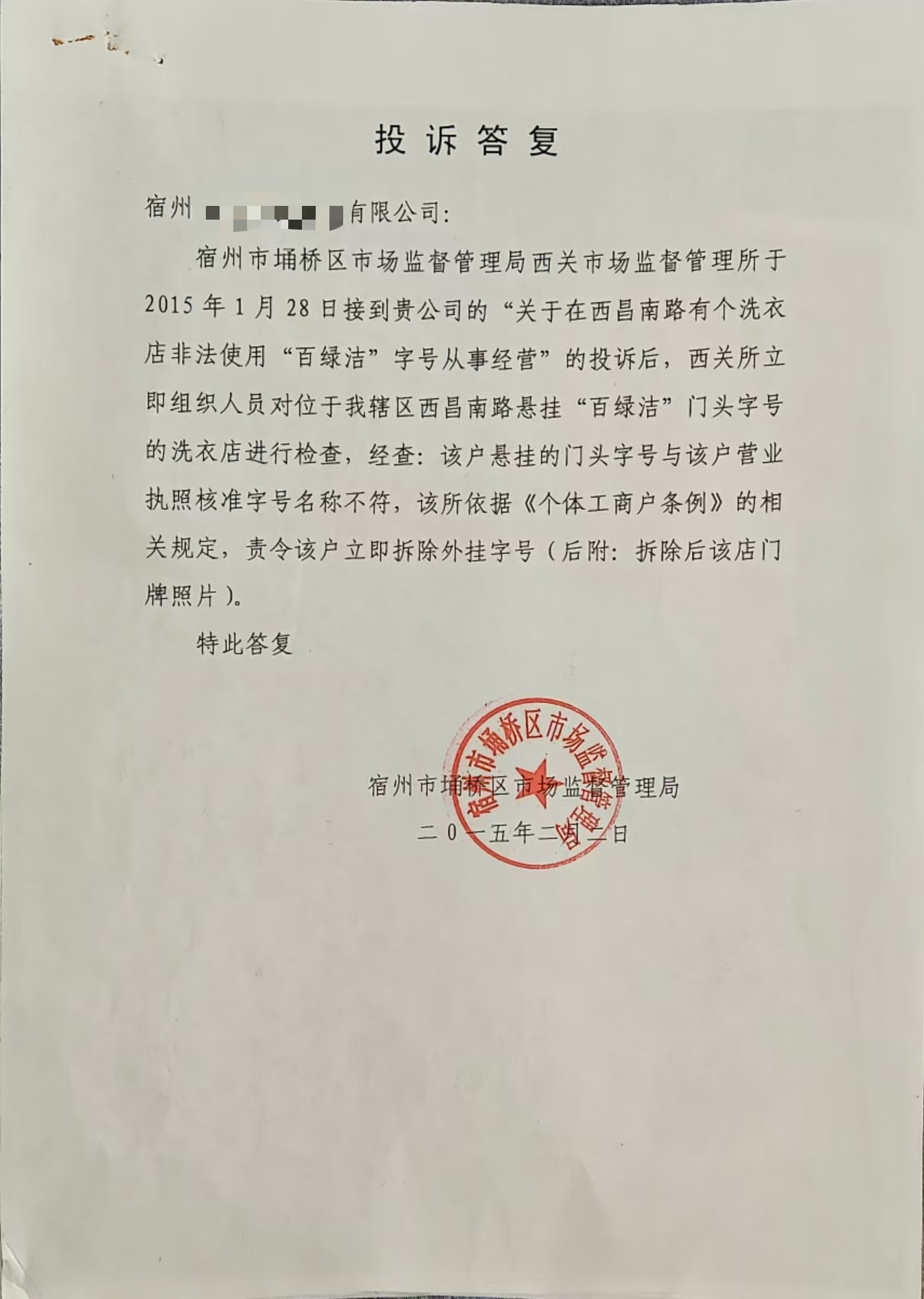 百绿洁”是我公司注册的商标,注册号:12303878 ,近期发现宿州市西昌南路某洗染店未经我公司授权私用我公司注册的“百绿洁”品牌从事洗染业务,经厉害关系人举报,当地工商局重拳出击,关闭该违法商户,我公司将继续通过法律途径维护自身的合法权益。