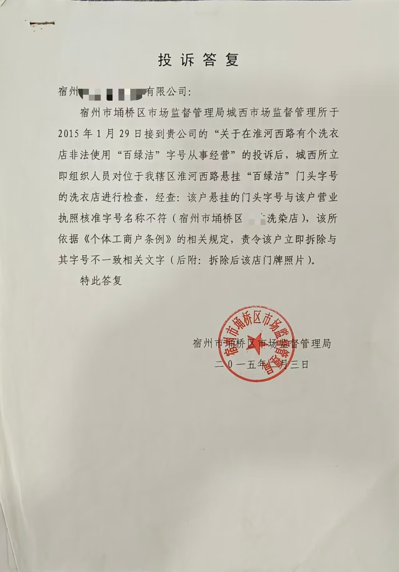 “百绿洁”是我公司注册的商标,注册号:12303878 ,近期发现宿州市淮河西路某洗染店未经我公司授权私用我公司注册的“百绿洁”品牌从事洗染业务,经厉害关系人举报,当地工商局重拳出击,关闭该违法商户,我公司将继续通过法律途径维护自身的合法权益。